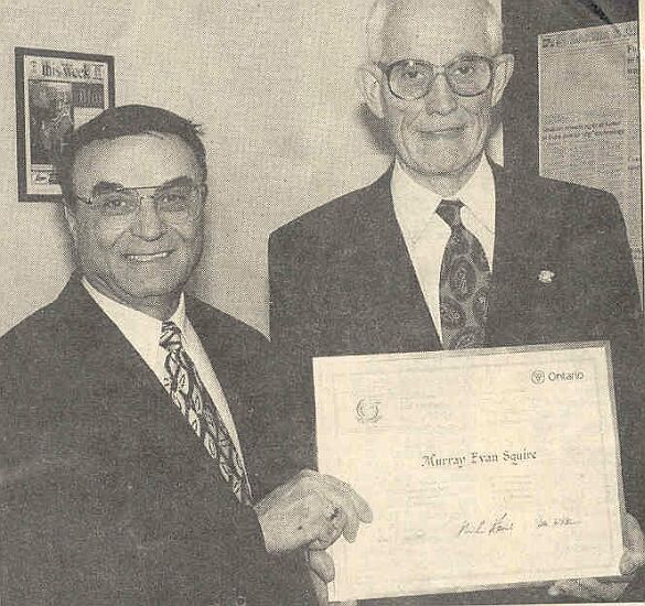 Sarnia's Murray Squire , right, is one of 21 seniors in southwestern Ontario honoured with an International Year of the Older Person award. MPP Dave Boushy, left, nominated Squire for advocating for seniors over the past two decades. Cam Jackson, minister of long term care with responsibility for seniors, presented Squire with a plaque at a reception in London recently. Among his many accomplishments, Squire has been the president of the local Pensioners Concerned since 1982. |